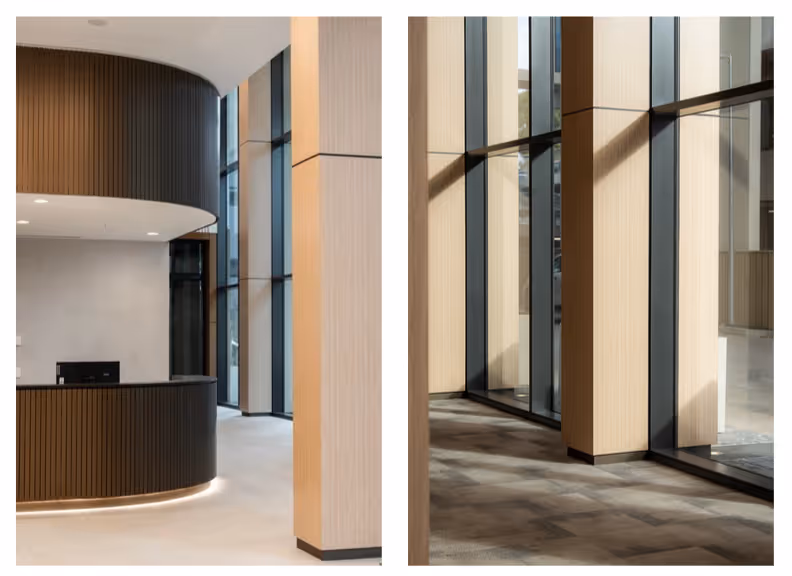 Arrival is celebrated through a double height framed entrance, establishing a sense of welcome and legibility. Movement is further articulated by the expressed fire stair on the street frontage, a vertical gesture that highlights circulation and fosters inter tenancy connection for staff.
